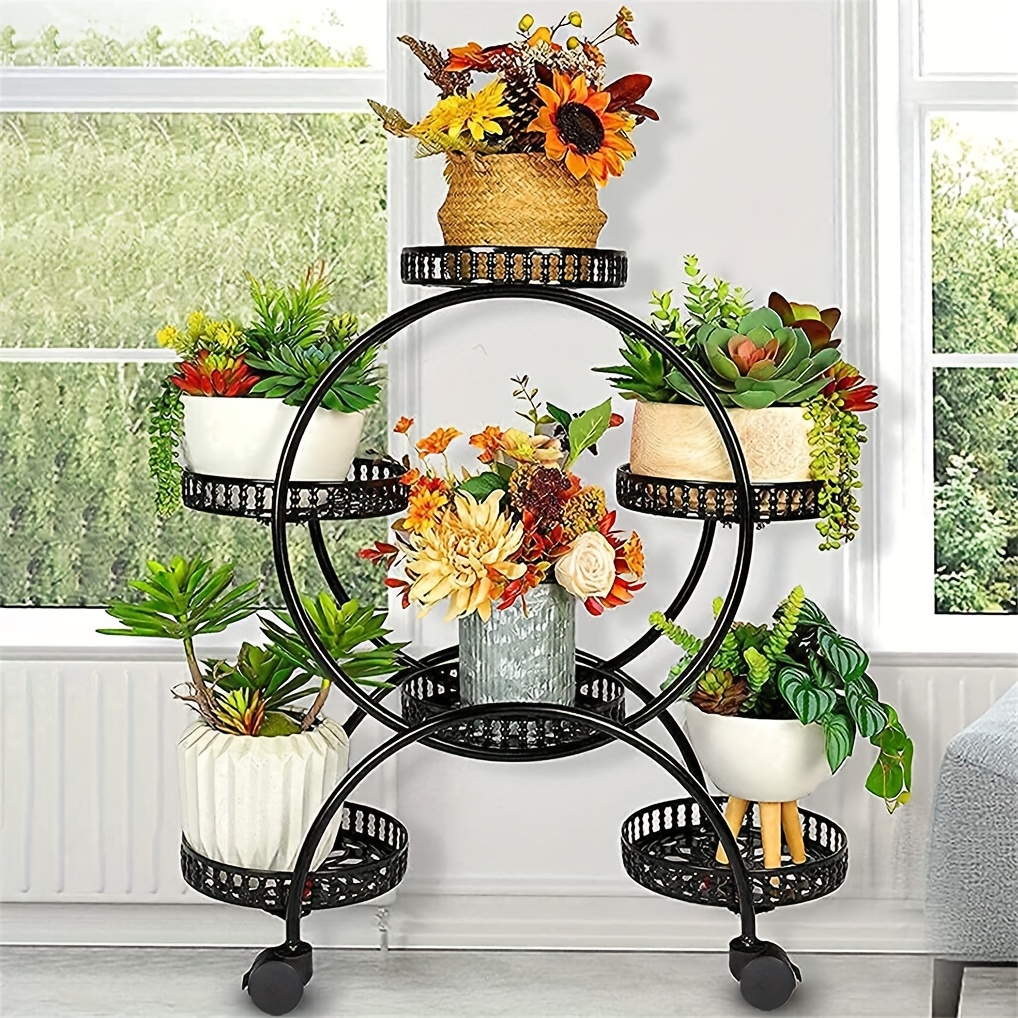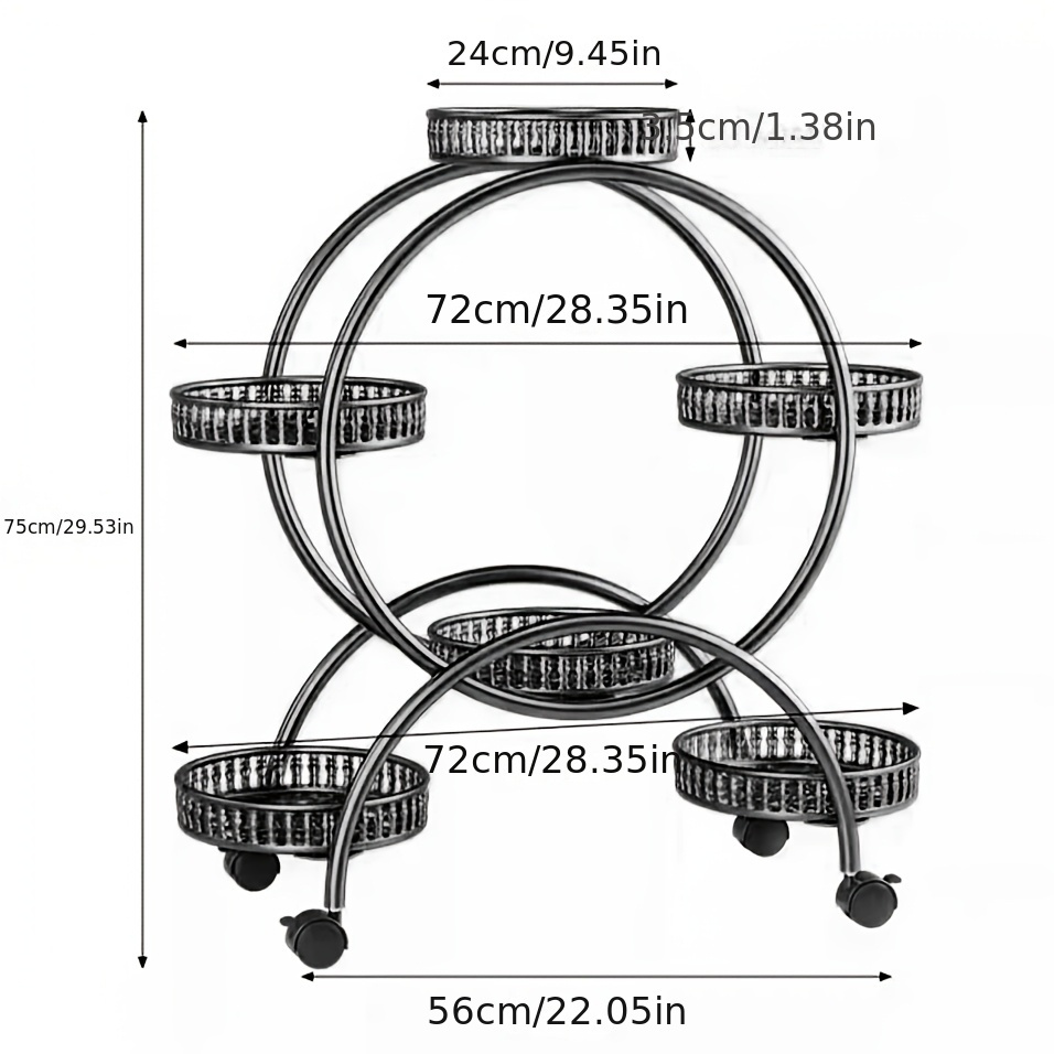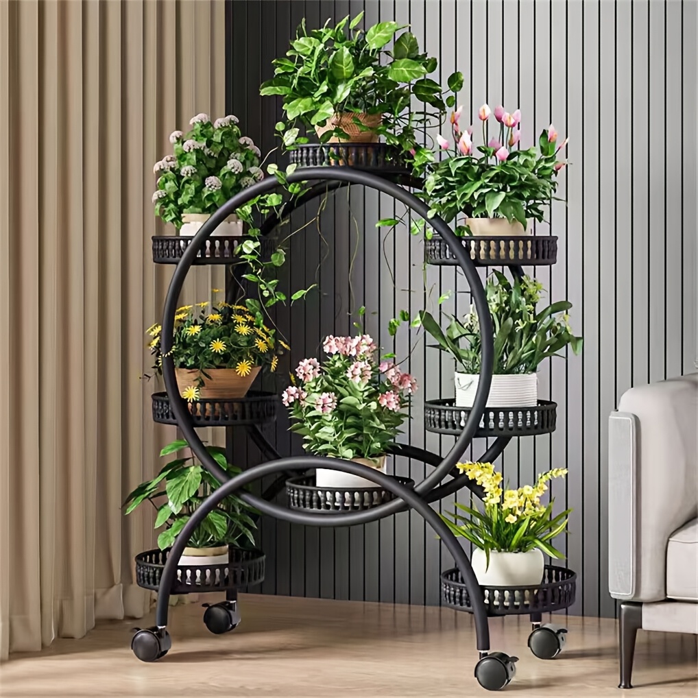 Six-Tiered Black Metal Plant Stand Garden Cart with Wheels for Displaying Flower Pots, Ideal for Home, Patio, Porch, And Balcony Decoration